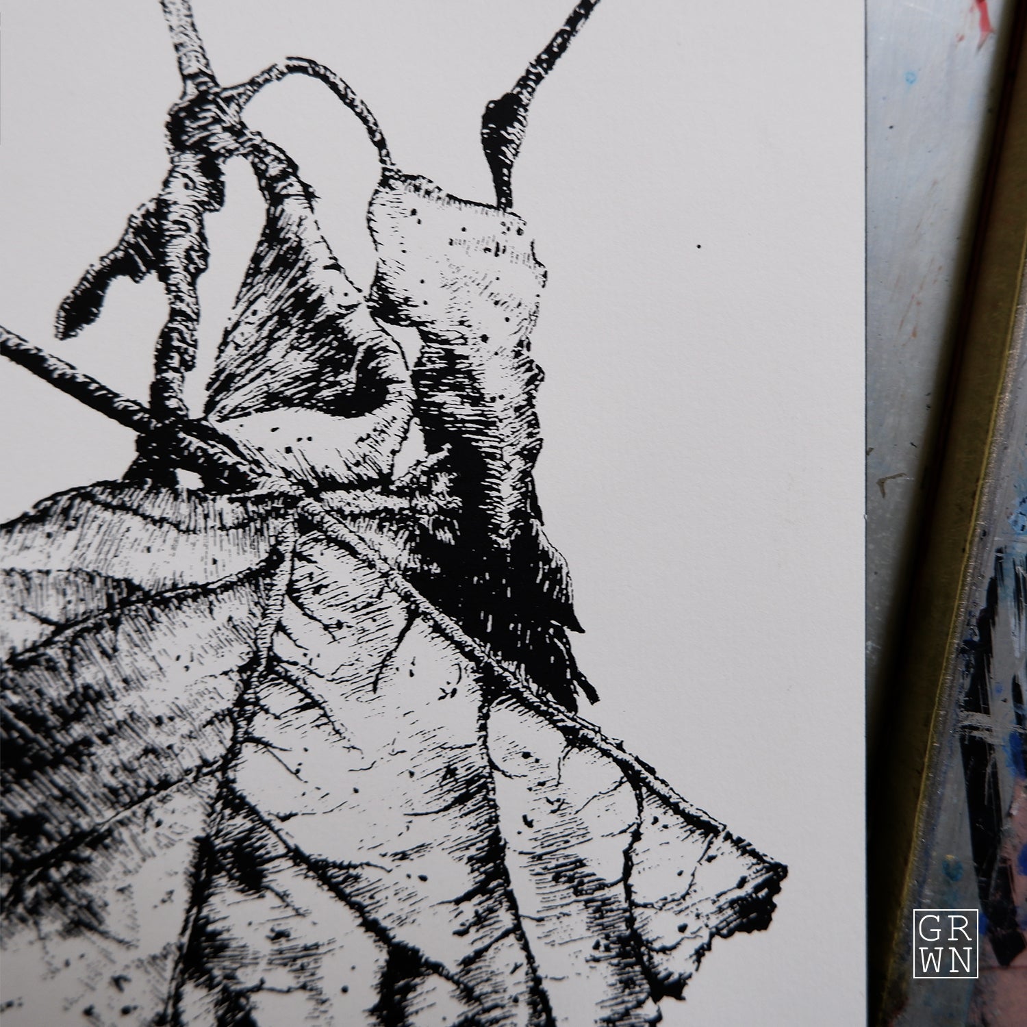 A pair of tipping leaves that are ready to fall, original drawing by GRWN, and screen printed reproduction created and sold by GRWN.