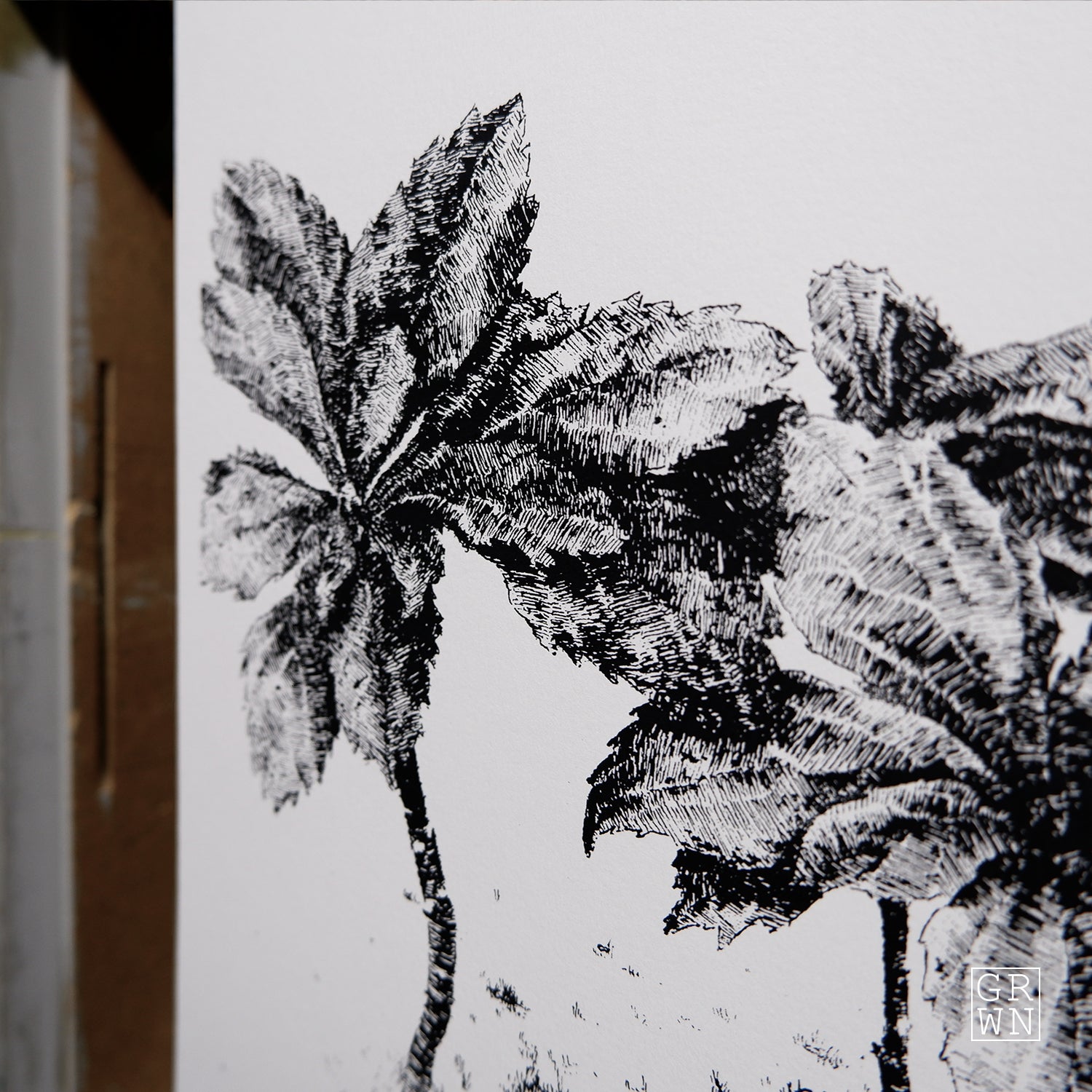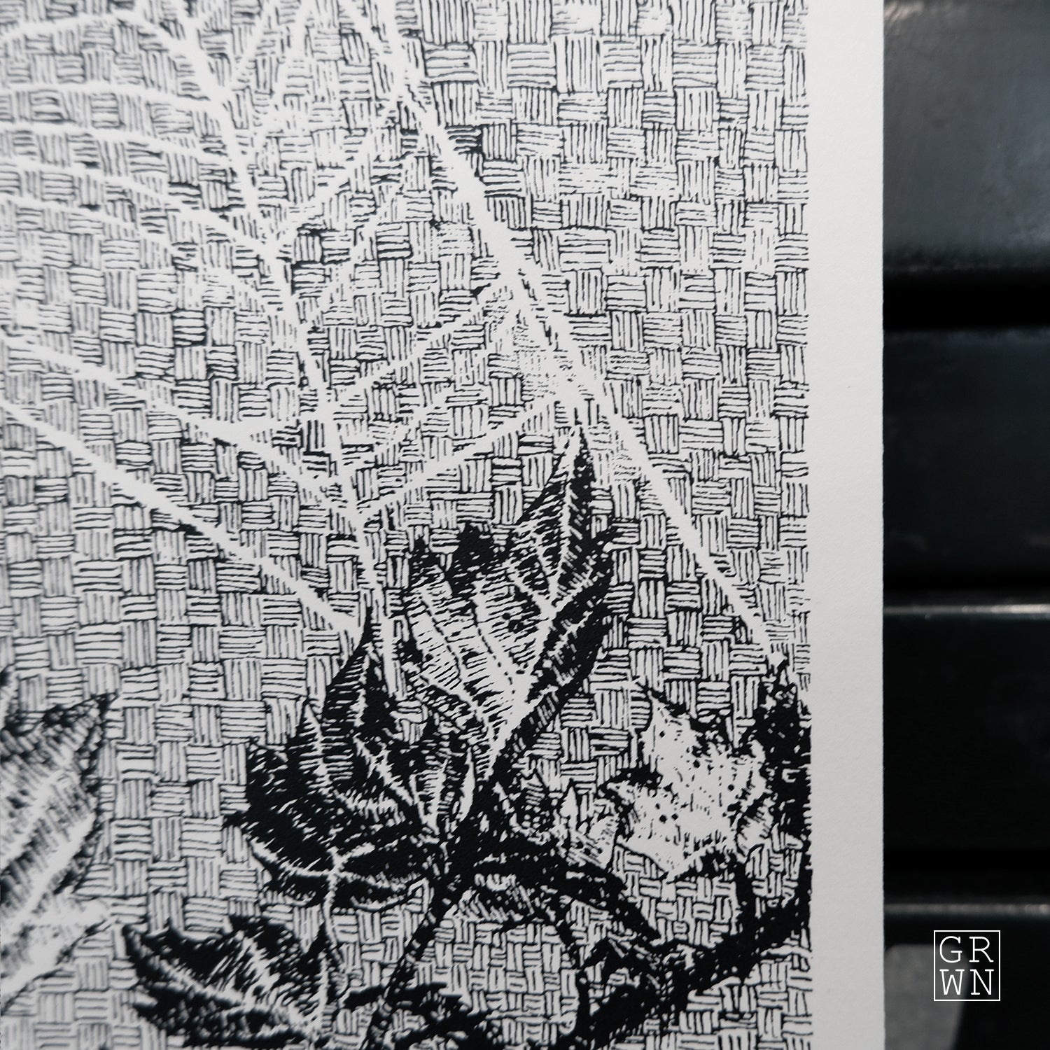Sunrise breaking through a gap amongst leaves, original drawing by GRWN, and screen printed reproduction created and sold by GRWN.